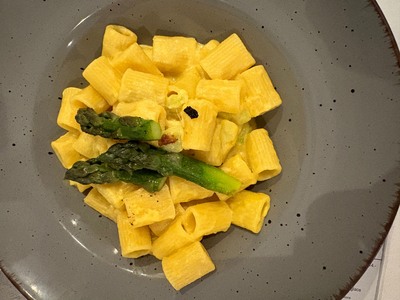 3) Focaccia asparago anchois, asperges vertes, crème de burrata, tomates cerises