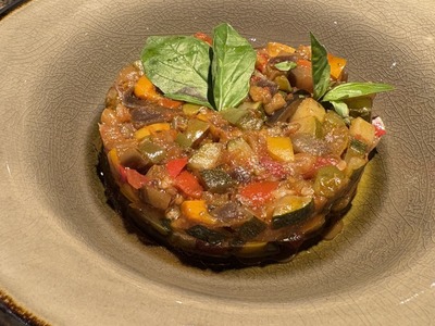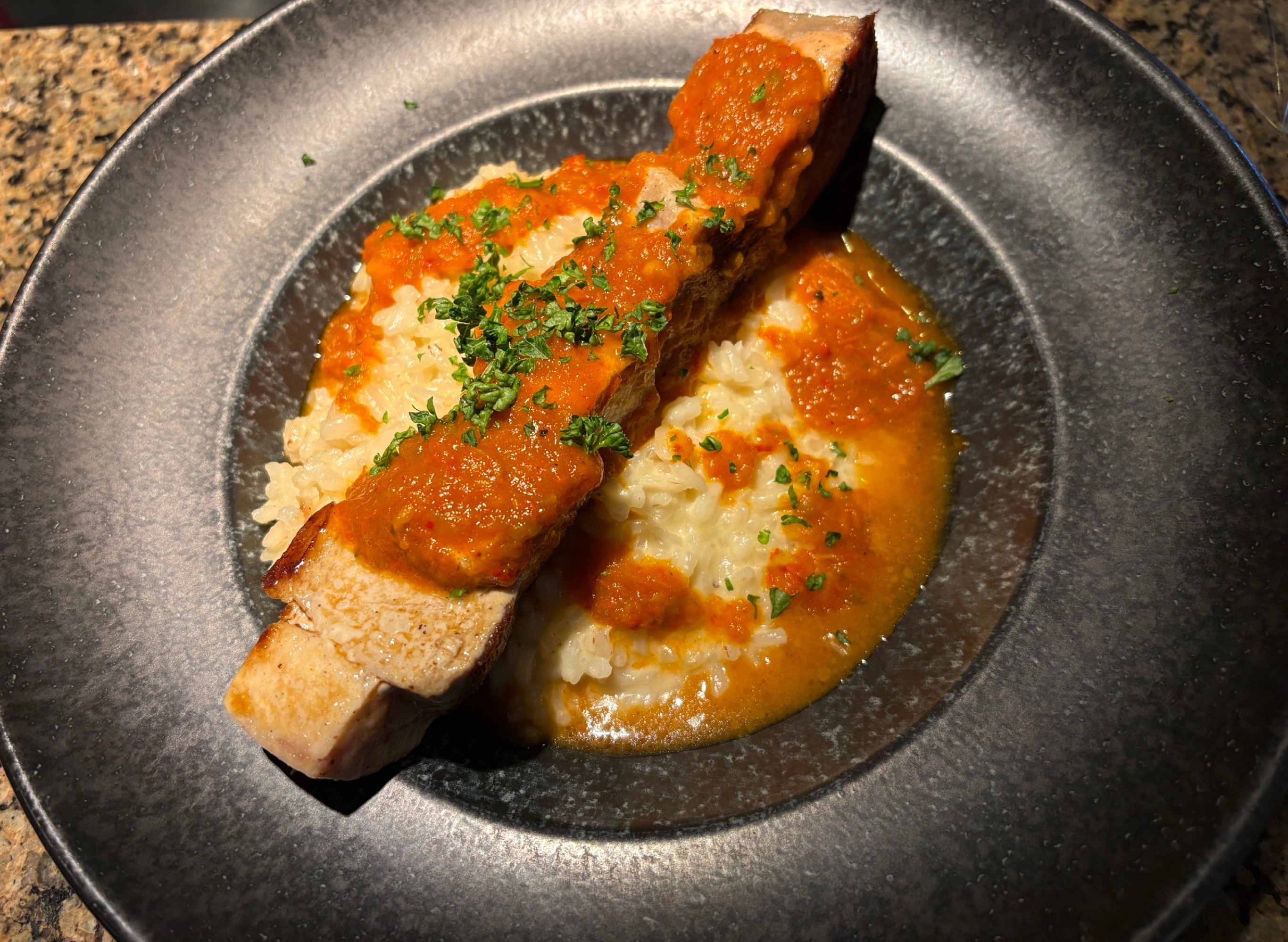 2) Brochette de poisson grillé, risotto au citron, crème de poivron
