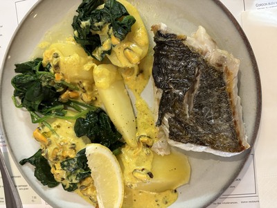 2) Lieu noir à la plancha, sauce mouclade, tombée d'épinards, pommes vapeur