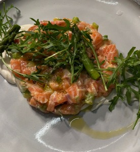 Plats : 1) Tartare de saumon & asperges vertes, frites